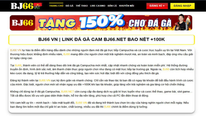 Việc đăng ký BJ66 cực kỳ đơn giản và chỉ mất vài phút. Sau khi hoàn tất, bạn sẽ được khám phá kho trò chơi phong phú, nhận nhiều ưu đãi hấp dẫn và trải nghiệm dịch vụ cá cược trực tuyến an toàn, minh bạch.